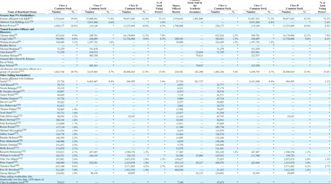 上市前, KKR持有39.6%的A类股,及71.6%的C类股,42.4%的D类股,一共拥有53.1%的投票权;
