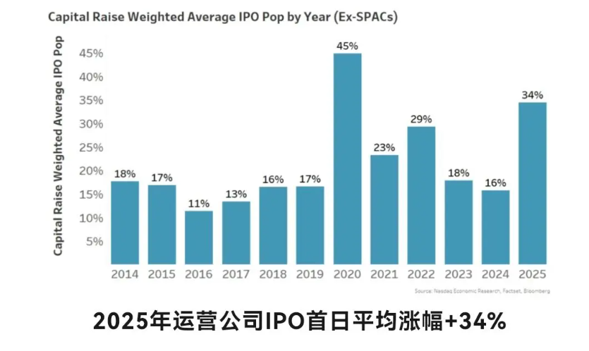 更值得关注的是 IPO 企业的市场表现,尤其是首日涨幅,以市值加权法计算,2025年运营公司上市首日平均涨幅达34%,这一数据不仅是2023年、2024 年平均涨幅的两倍,更是自2014 年以来的次高水平,仅低于2014年的45%。